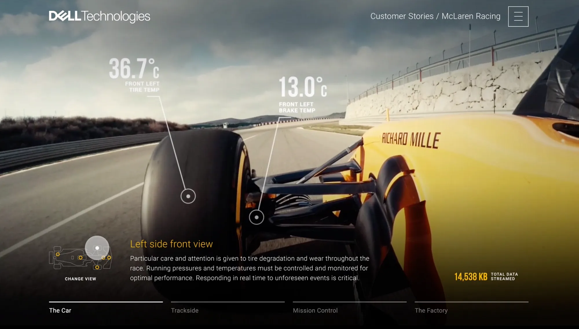 Dell Technologies’ relationship with McLaren is a very tight one. The data collected and analyzed in a typical race is mind-blowing, and Dell’s sensors, equipment, services and capabilities are embedded in the equipment and are powering every step of the race cycle. The design uses a typical race — depicted through real footage — as the interaction model, inviting the user to switch between cameras and sensors on the race car and telling this deep integration story.